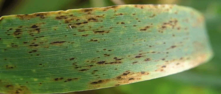 The disease initially appears as small brown spots on barley and wheat leaves during the tillering phase. These spots elongate into dark brown or black streaks with a net-like pattern. As the infection progresses, lesions expand along leaf veins, surrounded by a chlorotic yellow border. Severely affected leaves die off, weakening the plant and reducing photosynthetic capacity.